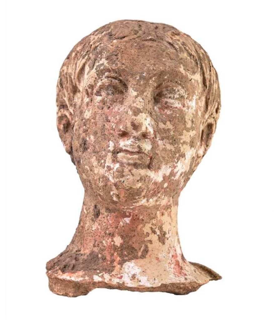 Questa testa di statua a tutto tondo, residuo di una scultura più grande, è stata portata alla luce durante gli scavi effettuati nel 1878 dall’archeologo Emmanuel Fernique per l’École française de Rome, nel santuario di Ercole a Palestrina. Fratturato al collo e realizzato a stampo e a mano, presenta capelli corti e ricci finemente ritoccati con strumenti, così come alcuni dettagli delle narici e delle orecchie. Un frammento di abbigliamento, visibile in corrispondenza della rottura sulla spalla sinistra, fa pensare a una toga. Conservato così com’era quando è emerso dalla terra, è caratterizzato dalla conservazione di tracce di preparazione bianca e di colore rosso, a testimonianza della sua originaria policromia. Attribuita a una produzione etrusco-laziale, probabilmente locale, l’opera è databile tra la fine del IV e l’inizio del III secolo a.C., grazie al suo stile influenzato dalla tradizione classica. Dovrebbe aver avuto funzione di ex voto, raffigurando un devoto, molto probabilmente il dedicatario stesso.