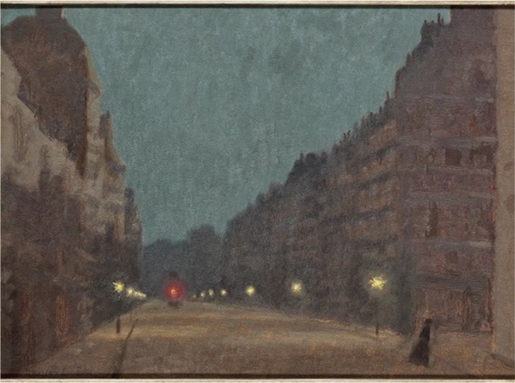 Le ciel de Paris, la Seine, la lumière, les reflets constituent les sujets de prédilection de Charles Lacoste, dont la peinture se distingue par une absence d’épaisseur. Le flou et l’évanescent, qui s’opposent aux formes solides et souvent géométriques des monuments et des immeubles, caractérisent ses paysages urbains aux accents symbolistes. Ces vues de Paris constituent des sortes d’instantanés émotionnels. Ce terme convient également aux compositions parisiennes de Guilloux, peintes dans une opposition de teintes binaires, que l’artiste qualifie de « bonnes combinaisons d’émotion ». Il remarque que les couleurs sont porteuses de sensations comme « l’orange foncé – outremer » évoquant la « douleur, [le] deuil ». Si la plupart des vues de Paris peintes par Charles Lacoste sont immédiatement identifiables en raison de la présence de monuments célèbres comme la basilique du Sacré-Cœur à Montmartre ou encore le pont des Arts, elles restituent surtout l’atmosphère poétique d’un quartier à différentes heures du jour ou de la nuit. Metteur en scène du paysage parisien, l’artiste compose des nocturnes ou les lampadaires allumés, posés régulièrement le long des trottoirs, indiquent la profondeur de l’espace. S’inspirant d’un lieu réel, il compose des paysages décoratifs imprégnés de mélancolie. Son Paris, rue de nuit est proche de l’atmosphère du poème de Baudelaire, À une passante, où, dans la rue déserte, la silhouette furtive d’une femme vêtue de noir suscite le fantasme.