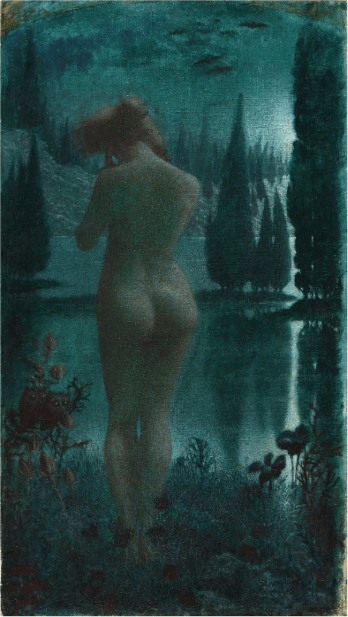 L’œuvre du symboliste Lucien Levy-Dhurmer (1865-1953) multiplie les femmes mélancoliques, les incarnations de l’automne et les figures du silence ou de l’énigme, au moyen d’un traitement virtuose du pastel. Si certaines œuvres, telles Circé et Hélène de Troie (collections privées), mêlent références homériques et contemporaines (dans ces deux œuvres, le décor qui accompagne les héroïnes n’est autre que Paris, désignant une actualisation des mythes), nombre d’autres pastels relèvent d’une intemporalité mystérieuse et poétique. C’est le cas du triptyque à l’huile L’Eden, exposé au Salon de la Société nationale des beaux-arts en 1899 et dont il existe une réplique au pastel et des reprises partielles. L’huile Regrets, version isolée de la partie droite du triptyque (les deux autres étant Émoi et Passion), s’inscrit dans la vision symboliste que le peintre donne de l’iconographie traditionnelle de l’histoire d’Adam et Ève. Levy-Dhurmer s’éloigne de la seule signification biblique pour évoquer les affres de l’amour sur un plan plus humain que théologique. Donnant à la femme nue, vue de dos, et dotée d’une coiffure contemporaine, la posture d’une pleureuse, l’artiste traite le personnage et le paysage dans une harmonie de bleus, jusqu’à presque les confondre. Couleur favorite de Levy-Dhurmer, ce chromatisme nocturne érige le paysage en sanctuaire de l’âme. La fusion de l’humain avec la nature ou le mystère de villes comme Bruges, Venise et Istanbul, est caractéristique du peintre entre 1896 et le début du XXe siècle. Sa pratique, plastique comme iconographique, atteint à une déréalisation qui projette le spectateur dans un autre monde.