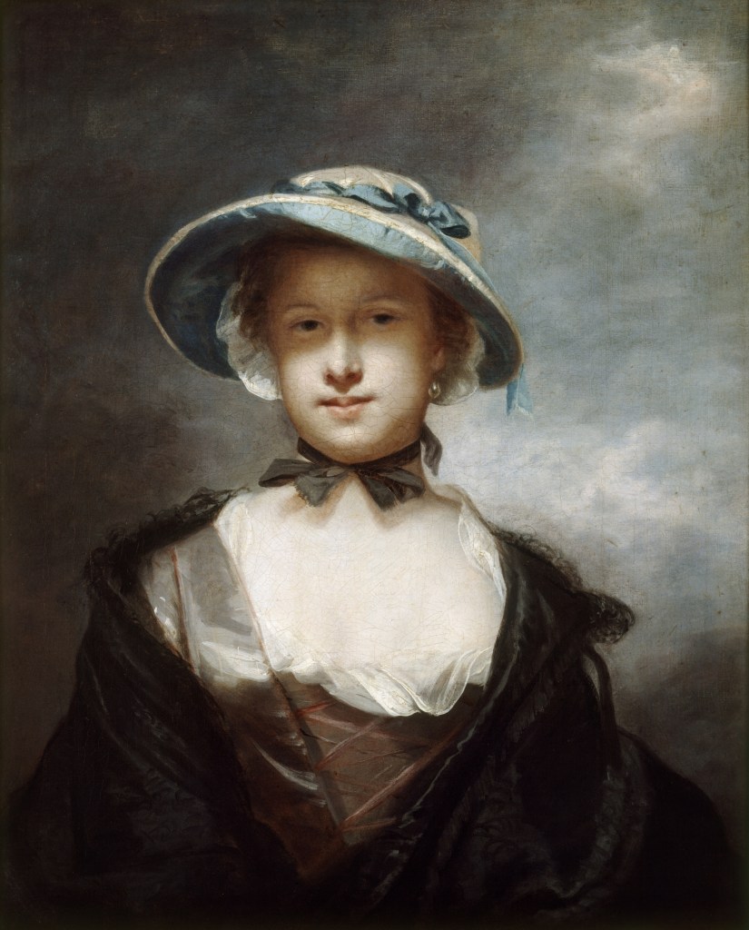 Ce charmant portrait de Catherine Moore est l’un des premiers tableaux acquis par lord Iveagh chez le marchand Agnew’s en 1887. Le portrait fut probablement peint par Reynolds en 1752 à Paris, lorsque Catherine Moore et son futur époux, l’architecte William Chambers, y séjournaient avant de se marier à Rome l’année suivante. Reynolds était alors sur le chemin du retour à Londres, après deux ans en Italie. La palette de couleurs pastel, avec des ombres douces sur le visage, est semblable aux œuvres des contemporains français de Reynolds. Le laçage croisé du bustier, d’où s’échappe par endroits la chemise, rappelle les bergères de fantaisie animant les pastorales de François Boucher (1703–1770) et Jean-Honoré Fragonard (1732–1806). Par contraste, le chapeau en soie bleue et ivoire est de style résolument anglais. Le choix de cet accessoire pourrait être une allusion au métier du modèle, puisque Catherine Moore était modiste.
