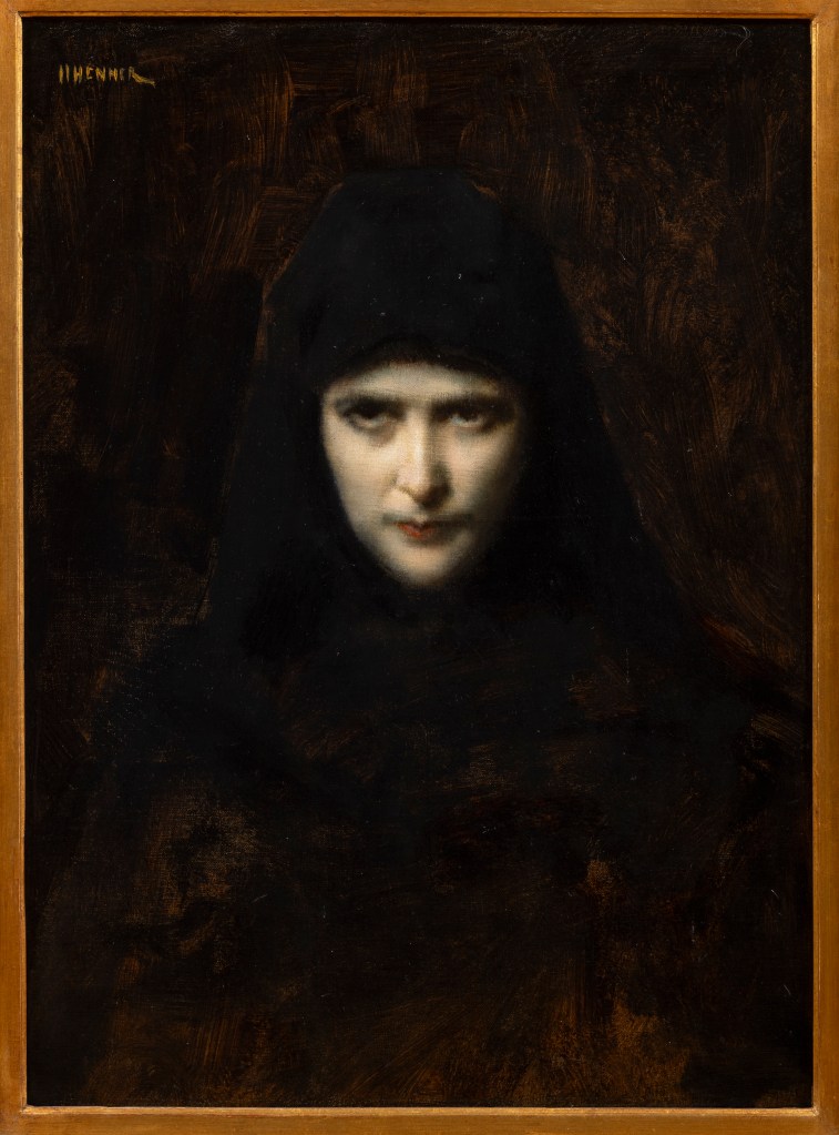 Henner la peint régulièrement dès les années 1890, l’élève jouant notamment le rôle de muse pour des études de têtes, dont certaines sont conservées au musée. Ici, Germaine Dawis pose pour une composition originale et énigmatique. L’œuvre est saisissante, le spectateur est comme hypnotisé par ce visage d’ivoire fantomatique qui émerge d’un tourbillon de brun-noir, mêlant le voile de la figure à l’arrière-plan. Présenté au Salon de 1903 sous le titre Religieuse, le tableau, d’une grande profondeur et sensualité, est encensé par la presse et reproduit dans certains articles.