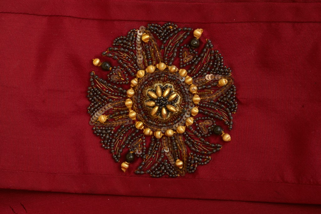 This dress belonged to Princess Natalie Paley. Her biographer, Jean-Noël-Liaut, stated that Paley’s social connections and influences in Europe, coupled with her dazzling presence in fashion magazines, made her a “goddess of the 1930s”. Her marriage to couturier Lucien Lelong from 1927 to 1937 added another interesting credential, beneath her status as a princess and her Romanov connection. Edward Steichen protégé George Hoyningen-Huene photographed Natalie for many projects in the following decades, from her fleeting turn as a 1930s film star to her time as client manager and face of fashion house Mainbocher in New York. The American fashion designer Main Rousseau Bocher (who designed under “Mainbocher”) served in intelligence during the First World War and stayed in Paris after the war, eventually growing a successful couture firm. He fled to New York City in 1939 as the Second World War loomed. Previously connected via the Parisian fashion industry circles of the 1920s and 1930s, Natalie Paley began working for Mainbocher in the fall of 1941, managing his exclusive cadre of clients and wearing his designs, both in the fashion press and at events. Paley’s second husband since 1937 Jack Wilson noted that she was “blissfully happy… Everyone she knows from Hollywood or New York or any place… flock into Mainbocher’s all day long”, and he added that she was a “vital essential”. She accompanied Mainbocher to Paris for a visit after the war, in 1947, and continued to be affiliated with the firm through the 1950s, earning her a spot on the International Best-Dressed List from 1947 to 1954. She kept her wardrobe from this partnership, as seen by her red silk evening gown.