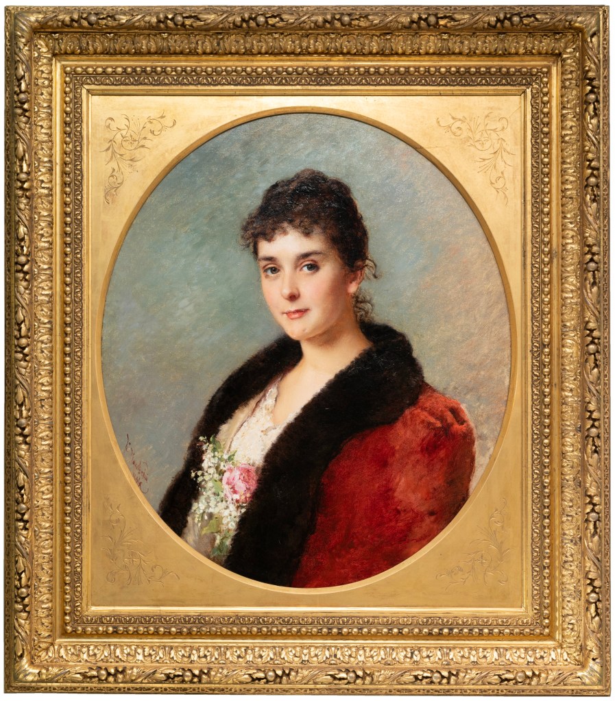 The portrait features Olga von Pistohlkors (born Karnovich), later known as Countess Olga von Hohenfelsen (1904) and Princess Olga Paley (1915) (1865-1929), morganatic wife of Grand Duke Paul Alexandrovich of Russia (1860-1919) and mother of Princess Natalie Paley (1905-1981).