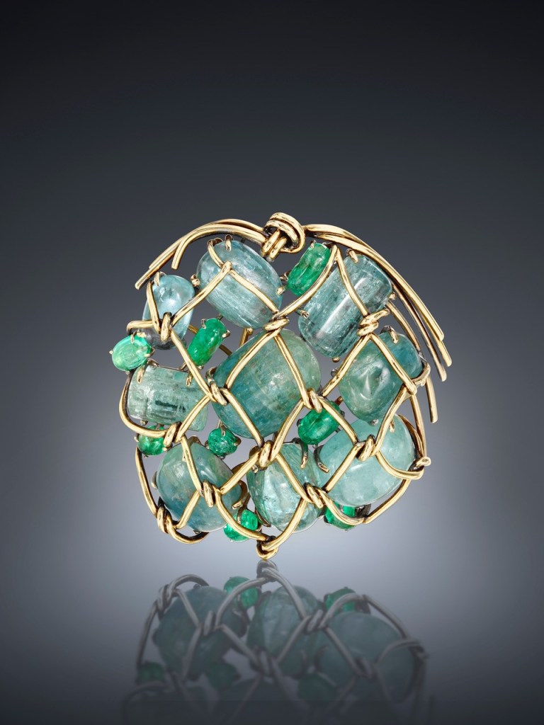 Natalie Paley was friends with many artists and creators including jewelry designer Fulco di Verdura (1899–1978), a regular guest at Pebbles, Princess Natalie and her second husband Jack Wilson’s country house. The setting was relaxed American cool—and the princess embodied it best in breezy dresses, chic sunglasses, and a hat or a brooch. Verdura was known for his use of sumptuous precious stones in imaginative settings, as seen in this “wrapped package” brooch enclosing aquamarines and emeralds in a delicate gold cage made for Natalie Paley.