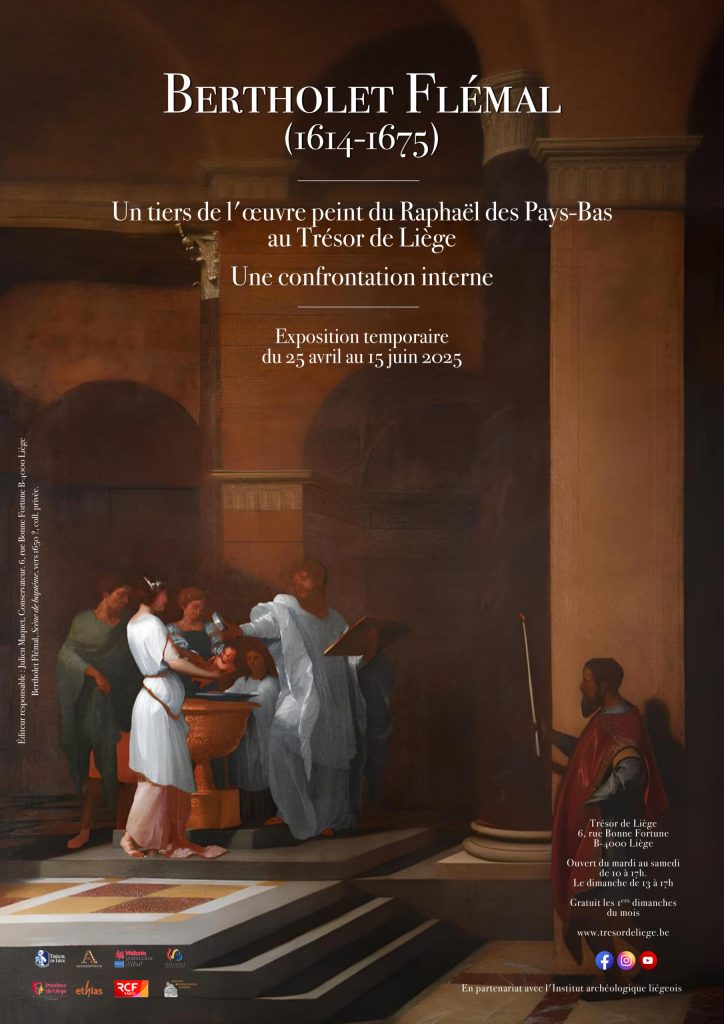 En partenariat avec l’Institut archéologique liégeois, à l’occasion de son 175e anniversaire, le Trésor de la cathédrale de Liège a mis sur pied l’exposition intitulée Bertholet Flémal (1614-1675). Un tiers de l’œuvre peint du Raphaël des Pays-Bas au Trésor de Liège. Une confrontation interne. Elle a pour ambition de commémorer le 350e anniversaire du décès de ce grand peintre liégeois qui travailla, entre autres, pour Louis XIV au palais des Tuileries. Au départ des deux plus grandes collections de tableaux de cet artiste, cette exposition se présente comme une sorte de confrontation interne à son œuvre peint avec, d’une part, les 10 tableaux religieux conservés à la cathédrale de Liège et, d’autre part, 13 tableaux pour l’essentiel profanes d’une importante collection privée de la région liégeoise. Le public pourra ainsi découvrir, à travers des toiles de grande qualité, le caractère protéiforme de l’art de celui que le peintre allemand Joachim von Sandrart – qui semble l’avoir rencontré à Rome – surnommait le « Raphaël des Pays-Bas », rendant ainsi hommage à l’accent classicisant de ses tableaux, bien éloignés de la production rubénienne qui dominait alors les Pays-Bas méridionaux.