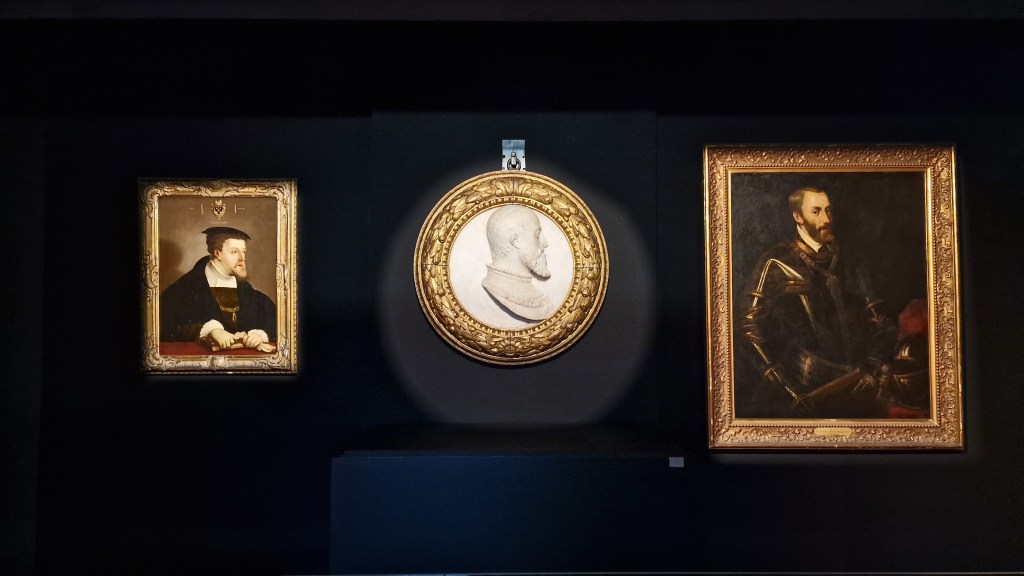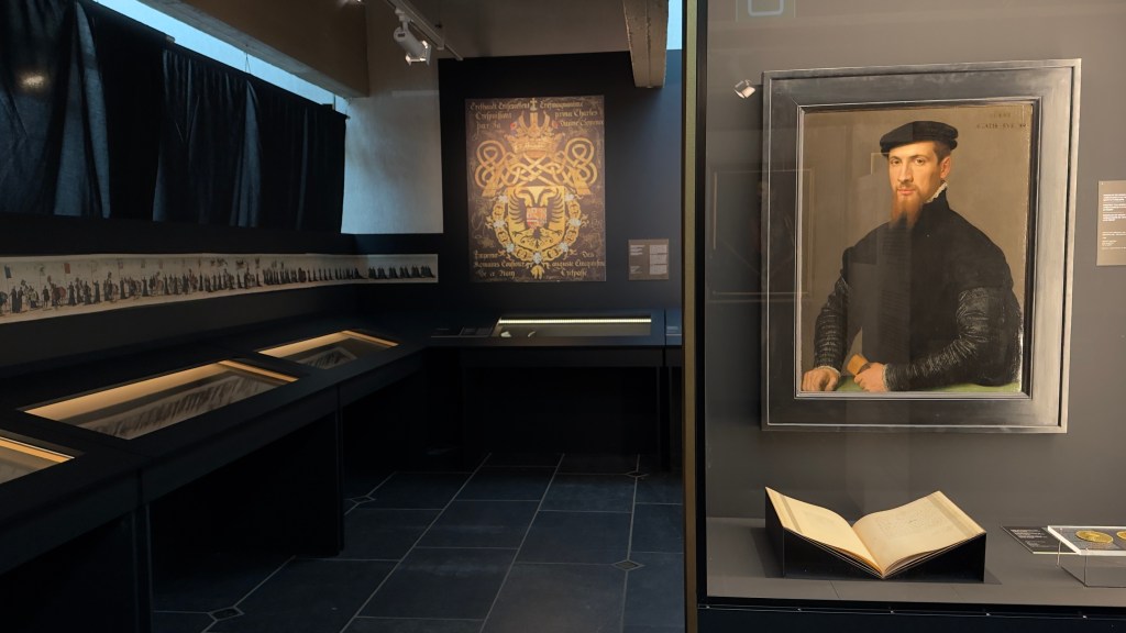 Plus de quarante institutions ont contribué à rassembler un ensemble exceptionnel : tableaux, sculptures, dessins, gravures, manuscrits, orfèvreries et documents d’archives témoignent de la place et du rôle politique, diplomatique et artistique de Marie de Hongrie. Parmi les pièces majeures figurent des portraits attribués à Titien, des éléments de décors sculptés de Jacques Du Brœucq, ou encore deux tableaux aux vues paysagères grandioses signés par Jan Brueghel de Velours et Denijs van Alsloot. L’exposition présente également, pour la première fois au public, la grande tapisserie acquise récemment et restaurée pour la circonstance par le Cercle royal des Amis de Mariemont.