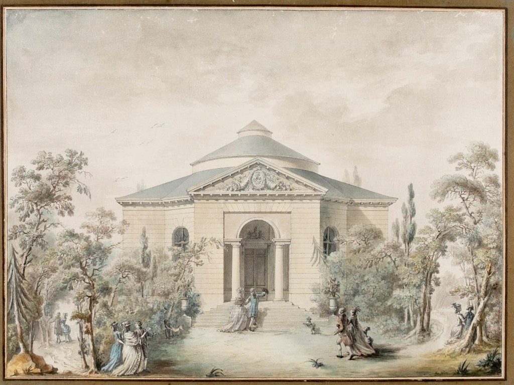 Le dessin aquarellé provenant de la collection du Musée départemental de Sceaux, nous montre ce pavillon de musique immergé dans un paysage champêtre. Le plan centré, couronné d’un petit dôme avec éclairage zénithal, les façades décorées de refends, la grande serlienne surmontée d’un fronton majestueux, font de ce pavillon un chef d’œuvre de l’architecture « à la grecque » de la fin du XVIIIe siècle. Ce vaste ensemble comprenant demeure d’agrément et jardin paysager correspond pleinement aux archétypes des demeures de plaisance, qui fait ici fortement écho aux aménagements du Hameau de la Reine au Petit Trianon.
