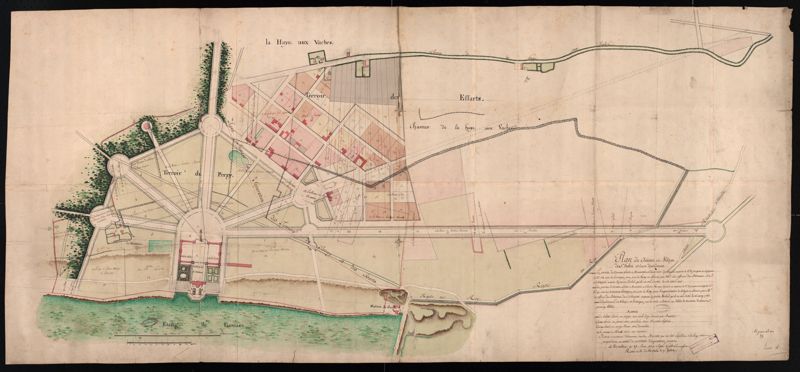 La seconde section de l’exposition présente un très grand plan, prêté par les Archives départementales des Yvelines, figurant le projet d’Ange-Jacques Gabriel (Paris, 1698 – Paris, 1782) pour le château et le village de Saint-Hubert.