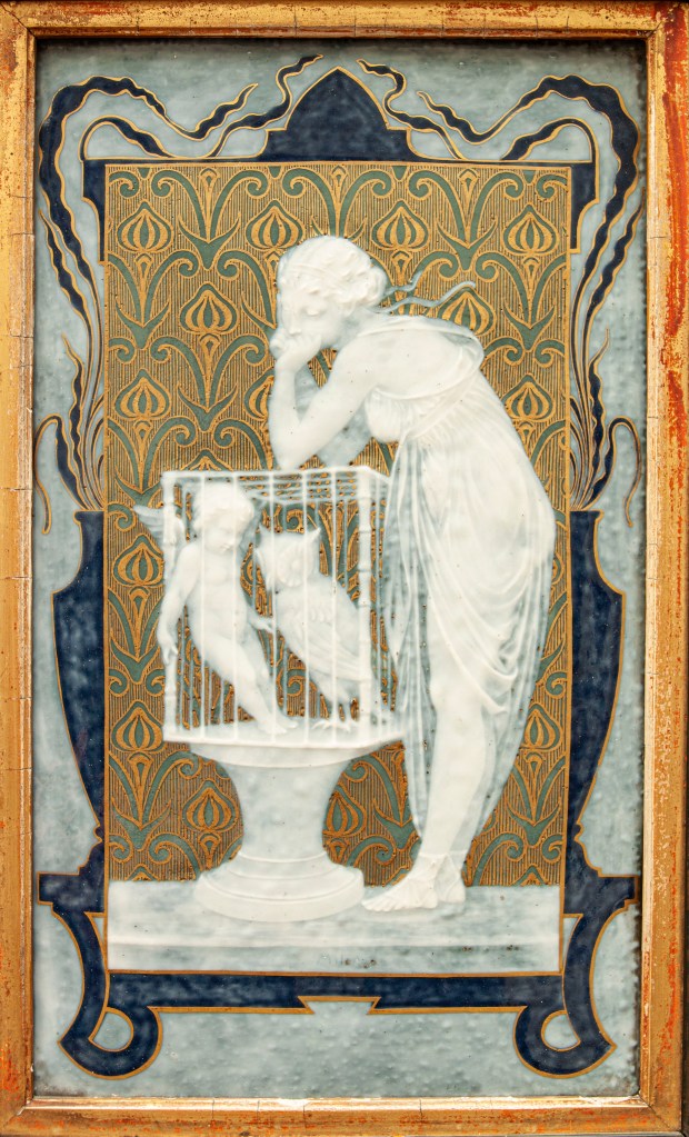 Dans cette œuvre, l’artiste Marc-Louis-Emmanuel Solon (Montauban, 1835 – Stoke-on-Trent, 1913) utilise la technique de la pâte-sur-pâte, méthode qu’il inventa lui-même. Ce procédé consiste à décorer une pièce colorée déjà cuite à l’aide de barbotine blanche (pâte de porcelaine délayée) afin de donner du relief et de la transparence au dessin. L’artiste compose ici un décor épuré à la manière d’un camée antique dans lequel on retrouve l’influence de la manufacture anglaise de Wedgwood.