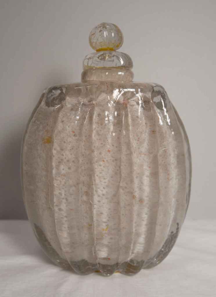 Maurice Marinot (Troyes 1882 – 1960) privilégie une approche expérimentale, centrée sur la matière elle-même. L’artiste explore le potentiel du verre épais dans lequel il développe des volumes massifs, souvent enrichis d’inclusions, de bulles ou de craquelures. Les surfaces, mates ou brillantes, révèlent une recherche sur la couleur et la texture plutôt que sur l’ornement.