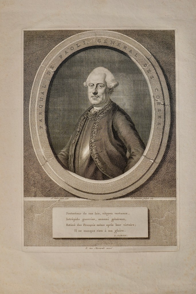 La représentation de Pasquale Paoli en farouche guerrier n’est pas nouvelle. En 1769, alors qu’il se rend à Londres où il vivra exilé jusqu’en 1790, Suzanne Caron exécute à La Haye un portrait de Paoli en cuirasse sous un habit aux revers brodés (fig. 2). Cette image fantasmée du rebelle qui a défié la puissante armée du roi Louis XV correspond à celle qui se crée dans l’imaginaire de ses contemporains. Témoin de l’époque, le Français Coste d’Arnobat rapporte la déception des Hollandais qui, « [s’attendant] à voir un guerrier défiguré de cicatrices et couvert d’un habillement aussi terrible que sa contenance », rencontrent « un homme poudré à blanc mis comme tout le monde et de l’extérieur le plus doux et le plus honnête ».