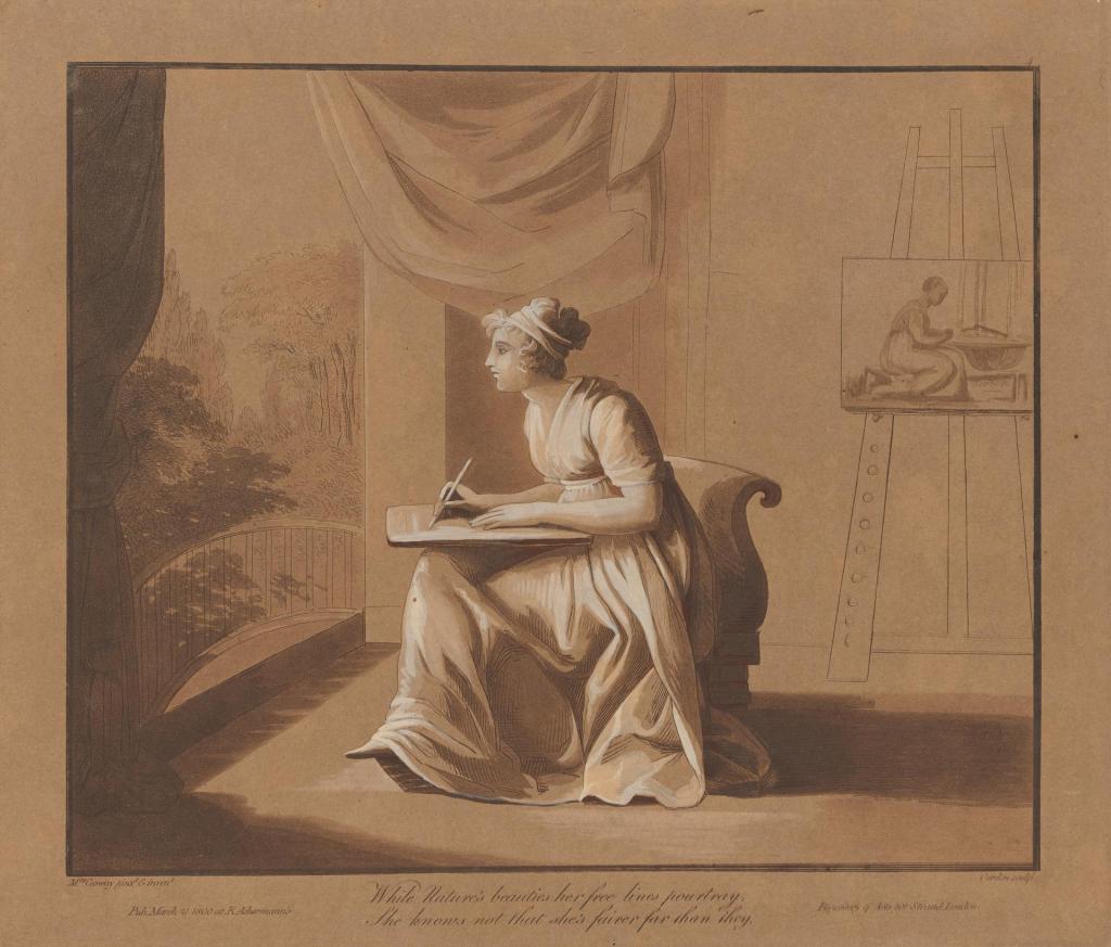 « Cela fait deux ans que je suis ici, mon établissement se porte très bien et j’ai la consolation d’être mère de 60 enfants. Rien n’est plus intéressant que de se rendre utile à ses semblables, et quel meilleur moyen que de faire leur éducation ! » À la mort de sa fille (1796), l’éducation des jeunes filles devint progressivement, pour Maria Cosway, un refuge sacerdotal. Avant l’ouverture de son école à Lyon (1803), elle aurait eu une première expérience pédagogique, au milieu des années 1790, dans un établissement à Knightsbridge. Mais c’est par le dessin que nous pouvons d’abord observer ses principes éducatifs destinés aux jeunes filles. Sa collaboration avec Rudolph Ackermann fut décisive. Éditeur de gravures, ce dernier possédait une boutique (The Repository of Arts) sur le Strand à Londres.