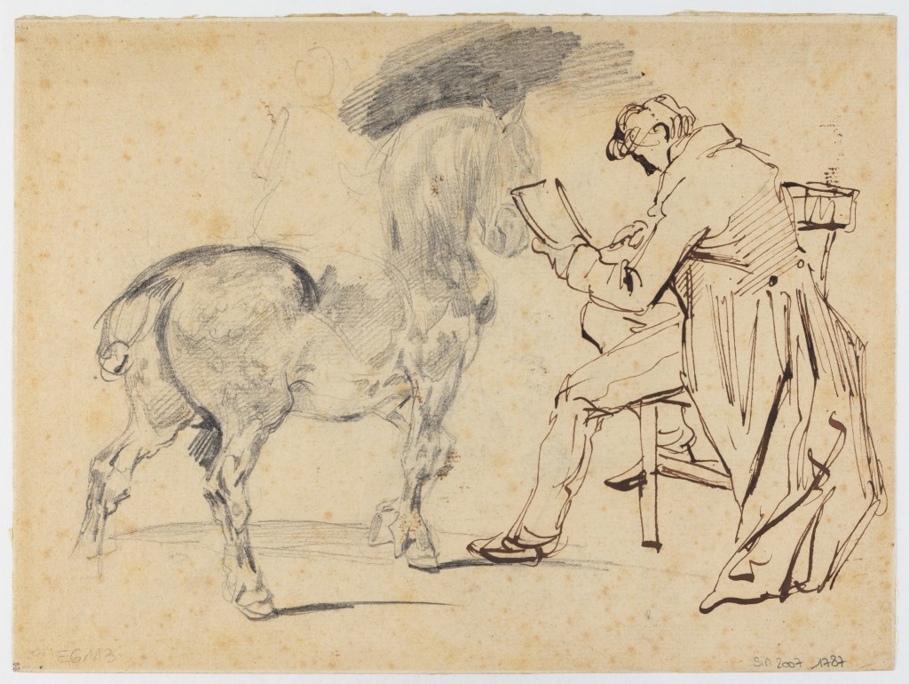 La partie gauche présente l’esquisse au crayon, très sûre, d’un robuste cheval figuré de trois quarts dos, monté par un cavalier dont la silhouette est à peine esquissée. On sait que Géricault, engagé en 1814 dans la compagnie des mousquetaires du roi et vouant une véritable passion pour le cheval, n’a cessé tout au long de sa carrière d’observer les chevaux, réalisant des dizaines de tableaux et des centaines de dessins (conservés notamment à l’École nationale supérieure des beaux-arts de Paris), explorant l’anatomie, le mouvement, l’expressivité et les émotions de l’animal, du champ de bataille à l’écurie en passant par le champ de courses. La partie droite du dessin présente quant à elle, à l’encre brune cette fois et presque en vis-à-vis du premier motif, mordant légèrement sur ce dernier, un homme adossé à une chaise dessinant – d’un geste vraisemblablement rapide – sur un carton, une feuille ou un carnet. Il est très tentant de considérer cette esquisse non seulement comme un autoportrait de Géricault, mais encore comme une mise en abyme du travail d’observation et de « notation » graphique que suppose sa pratique artistique. Et nous aurions, en prime, avec la partie gauche crayonnée, un exemple de ce que l’artiste a pu croquer sur le papier dans cette attitude. À moins qu’il ne s’agisse de la coexistence fortuite de deux croquis sans rapport direct sur un même feuillet, du reste également dessiné au verso, avec d’autres motifs d’un tout autre registre esquissés au crayon…
