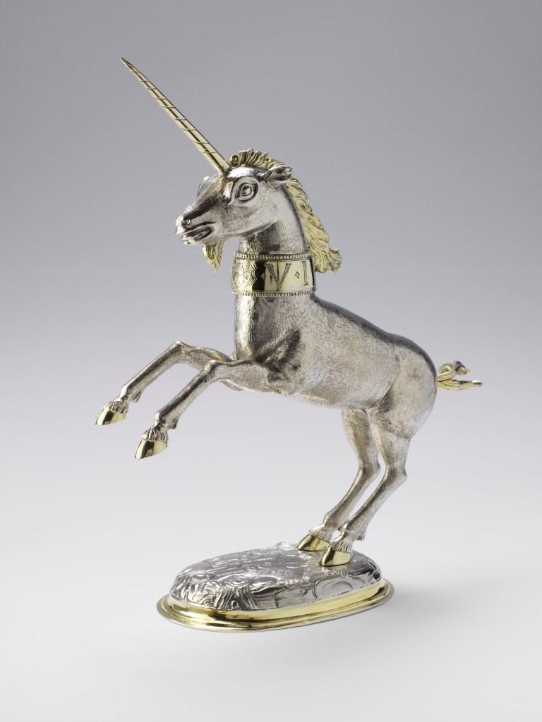 La Licorne est le chef-d’œuvre emblématique du trésor d’orfèvrerie du Musée historique de la Ville de Mulhouse. Ce « pokal », ou coupe couverte à boire en forme de licorne dont la tête est amovible, était conçu comme un objet spectaculaire qui dut faire la fierté de son commanditaire. La coupe à pied, forme venue du calice employé par le culte catholique, servait pour l’usage au quotidien mais fut aussi considérée comme un objet de prestige, et prit des formes riches et variées – une nef, un moulin, un aigle ou des animaux fantastiques –, faisant ainsi d’un objet utile un objet de luxe digne d’un cabinet de curiosités. La licorne est un animal fabuleux, le plus important de l’Occident chrétien du Moyen Âge à la fin de la Renaissance. Il s’agit d’un animal hybride à corps de cheval, doté d’une barbichette de bouc, de sabots fendus et surtout d’une longue corne spiralée et pointue portée au milieu du front le rendant si caractéristique. Des objets présentés comme d’authentiques « cornes de licorne » – en réalité des dents de narval – s’échangeaient et étaient censés purifier les liquides des poisons et guérir les maladies. Ces coupes extraordinaires, quelle que soit la forme qu’elles prennent, appartiennent à une typologie germanique ancienne trouvant ses origines à l’époque romaine. Le mode de fabrication de la Licorne est caractéristique : le corps de l’animal est constitué de deux coques inversées réalisées par la technique de la fonte. La base, elle, est forgée et repoussée dans une feuille d’argent. La corne, le collier, les sabots, la barbichette, la queue et la moulure de la base sont rehaussés d’une couche d’or fin, donnant couleur et richesse à l’objet d’argent étincelant.