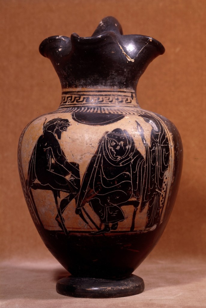 Oenochoé (vase à vin) attique à figures noires : l’ambassade d’Ulysse auprès d’Achille
