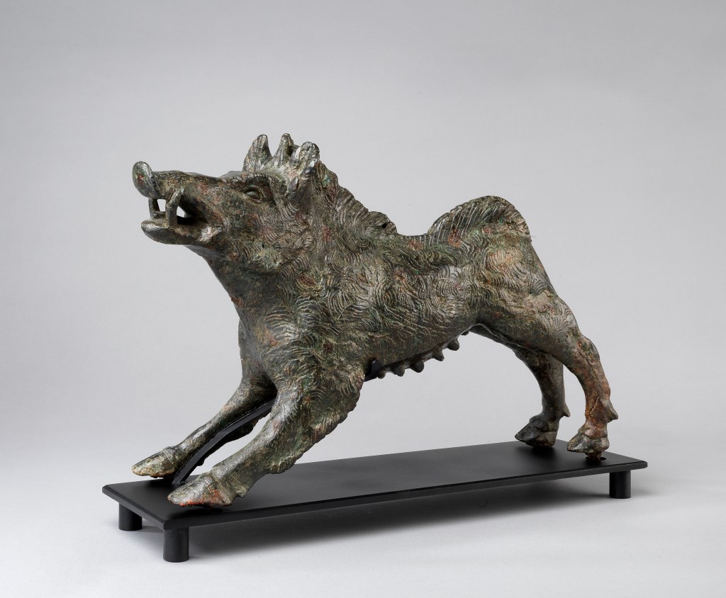 Cette sculpture en bronze, mise au jour en 1872 à Cahors avec un pied de grande statue, provient d’un site comprenant des colonnes, chapiteaux et mosaïques, probablement une maison de notable, un bâtiment public ou un sanctuaire. Située à Divona Cadurcorum, capitale des Cadurques, la ville antique atteignait près de 200 hectares à son apogée. La laie, remarquable par sa taille et son réalisme, est représentée en mouvement, dans une posture défensive : pattes arrière tendues, mamelles visibles, groin allongé, gueule ouverte dévoilant ses défenses. Sa crête et sa fourrure sont finement incisées dans le métal. Animal emblématique des Celtes, le sanglier apparaît aussi dans l’art gréco-romain, souvent dans des scènes de chasse, comme sur un sarcophage découvert à Saint- Béat. Réaliste et influencée par l’art hellénistique, cette sculpture évoque d’autres œuvres similaires produites en Gaule romaine aux IIe et IIIe siècles.