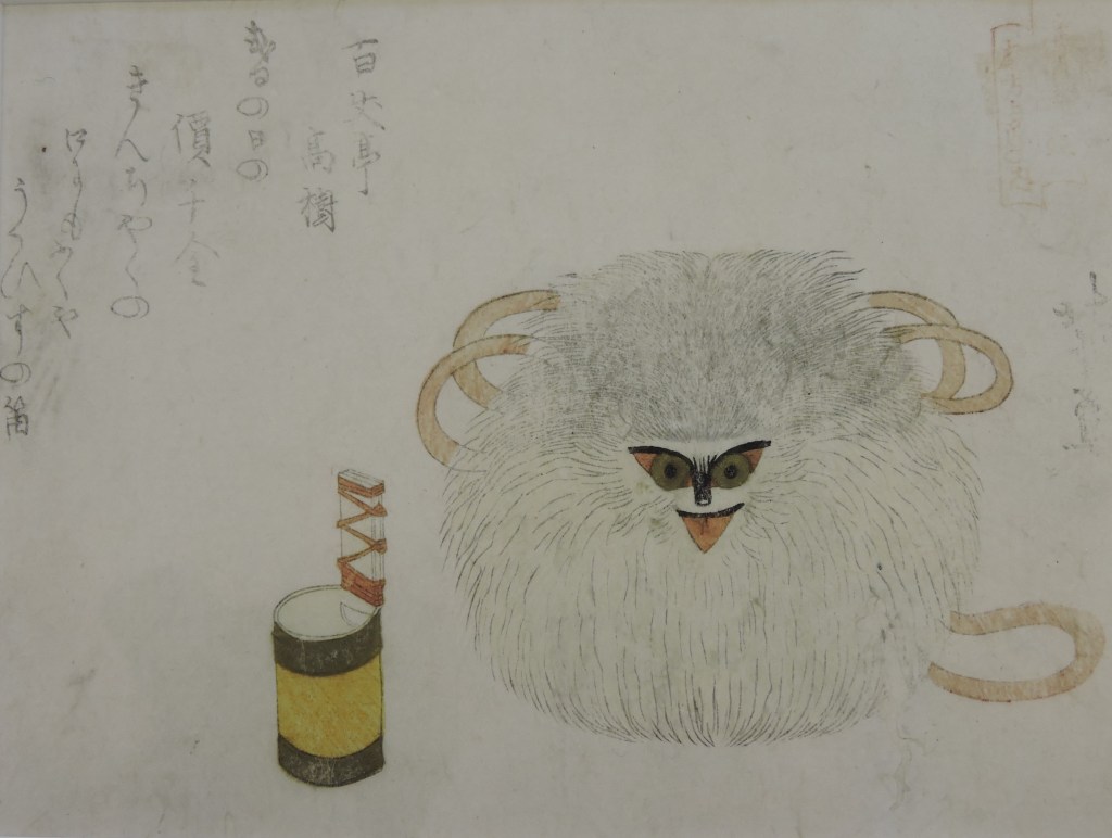 Un nouveau genre littéraire prend son essor au même moment que l’ukiyo-e : il s’agit du kaidan, la littérature de fantômes et de créatures fantastiques. Parmi les premiers jalons de cette littérature figure l’Otogi bōko, rédigé par Asai Ryōi (1612-1691) en 1666, année où il publie également l’Ukiyo-monogatari. Avec le développement de l’estampe, les histoires sont accompagnées d’illustrations. Ces ouvrages, appelés des e-hon, inspirent les artistes. Toriyama Sekien (1712-1788) consacre la fin de sa carrière à la compilation des figures surnaturelles, les yōkai, tirées du folklore. Il publie l’ensemble des créatures fantastiques recensées, plus de deux cents, issues de différents bestiaires. Il crée ainsi une véritable encyclopédie visuelle qui inspire encore les artistes de nos jours. L’Abumiguchi est tiré d’un yōkai au registre plus élégiaque. À l’instar des esprits-renard, l’abumiguchi naît d’un objet ou d’un animal errant depuis 99 ans. L’objet en question ici est un abumi, un étrier, qui aurait été abandonné par un guerrier mort. Après avoir attendu un siècle que son maître vienne le chercher, en vain, l’objet se transforme en Abumiguchi et erre de façon mélancolique. Ce petit monstre se reconnaît par sa forme sphérique recouverte de poils et la bouche en forme d’étrier.
