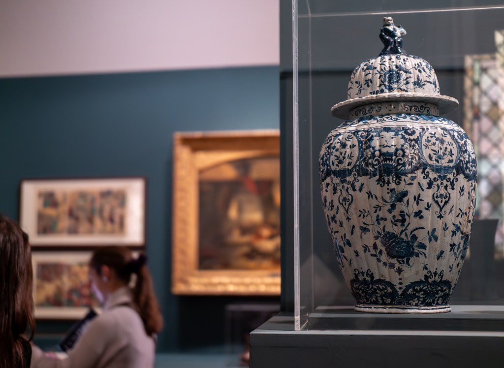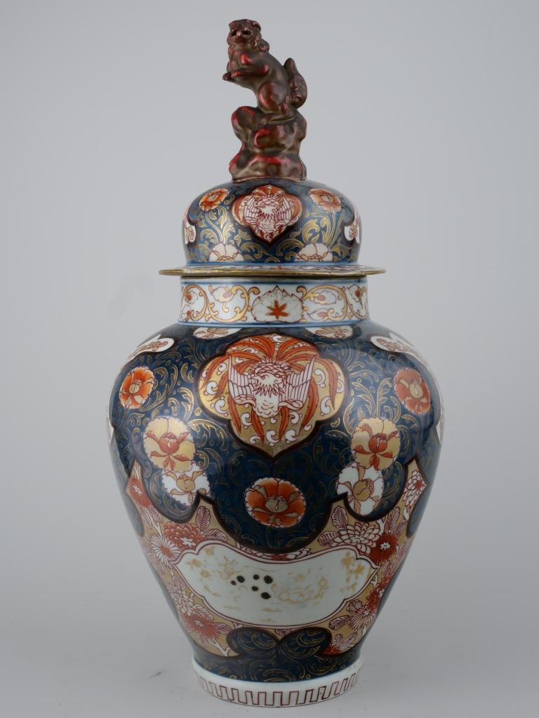 Les principaux centres de productions de la porcelaine japonaise sont Arita et Imari. Le décor de type imari se caractérise par un décor bleu (obtenu par l’oxyde de cobalt) appliqué sous la couverte, rouge (obtenu par l’oxyde de fer) sur la couverte et doré (avec de l’or délayé). La couverte est l’enduit vitrifiable apposée sur les porcelaines et les grès pour leur conférer un aspect brillant. Ce vase potiche présente un programme iconographique dense. Des rinceaux évoluent sur le fond bleu profond. Au niveau inférieur, un cartouche présente un shishi (lion gardien) entre un prunus et un bambou, symbole de la droiture. Le lion, figure protectrice, est reproduit en ronde-bosse sur le couvercle du vase potiche, hissé sur ses pattes arrière. Les cartouches se déploient sur un fond de chrysanthèmes et de feuillages. Des hôô (phénix, également symboles de bonheur et de renaissance) se détachent sur un fond doré orné de motifs en virgule. Ce dernier évoque le magatama, une forme ornementale utilisée au Japon depuis la préhistoire et considérée comme un des talismans offerts par la déesse Amateratsu, déesse du Soleil, et à l’origine de la lignée impériale. Des pivoines, évoquant la richesse et de jeunesse, s’épanouissent sur un fond bleu et or.