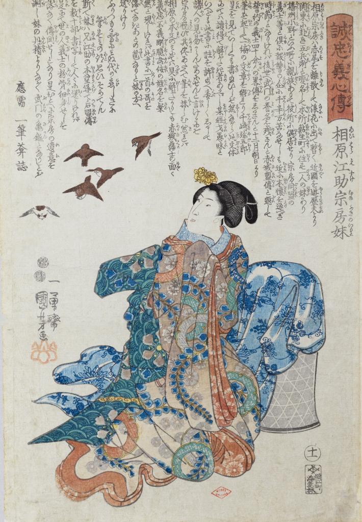 La série Histoire des cœurs fidèles est une série méconnue du public par la rareté de sa présence dans les collections muséales internationales. Elle se concentre sur la représentation de figures féminines qui gravitent autour des 47 rônins, sujet artistique et littéraire extrêmement populaire de la période Edo (1603-1868). L’artiste porte une attention particulière à la richesse des costumes. Son style se distingue aussi par son côté théâtral, presque caricatural. Les personnages ont l’air d’être saisis dans une attitude posée, renforçant le parallèle avec le théâtre kabuki dans lequel les acteurs s’immobilisent pour accroître l’effet dramaturgique et suspendre le temps. Si les figures se détachent sur un fond laissé en réserve, quelques éléments permettent subtilement d’évoquer le contexte. La composition simple concentre l’attention du spectateur sur le personnage.