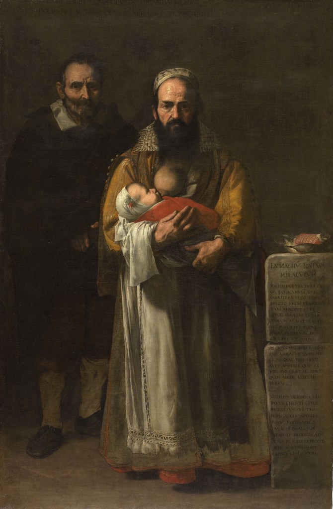 Quel tableau étrange que cette femme à barbe donnant le sein à un nourrisson, se présentant face à nous, accompagnée de son mari, derrière elle ! En 1631, Ribera est appelé au palais royal par le duc d’Alcalá pour témoigner par une œuvre d’un prodige de la nature. L’événement est explicitement retranscrit par l’inscription présente sur les blocs de pierre à droite : l’artiste a peint « d’après le modèle vivant » (AD / VIVVM MIRE DEPINXIT) le portrait de Maddalena Ventura, une femme de 52 ans originaire des Abruzzes qui, après avoir donné naissance à trois enfants, à l’âge de 37 ans, se vit pousser une barbe épaisse, sans doute du fait de dérèglements hormonaux. Le peintre tient à attester de ce prodige de la nature (EN MAGNV[M] NATVRA MIRACVLVM), précise l’inscription, qui devait constituer un phénomène tel qu’il était digne d’être consigné par le plus célèbre peintre de Naples à ce moment. Ribera date (16 février 1631) et signe son œuvre, en se comparant lui-même à Apelle, peintre le plus illustre de l’Antiquité. Ribera nous offre un portrait de famille résolument non conventionnel, en rupture radicale avec l’art du portrait de cour en son temps. Le spectateur ne peut qu’être frappé par cette image frontale mettant l’accent sur le contraste entre la longue barbe noire et le sein blanc gonflé de lait sorti du corsage pour nourrir l’enfant. Néanmoins, la grande humanité, voire la noblesse, des figures l’emporte sur l’incongruité de la représentation.