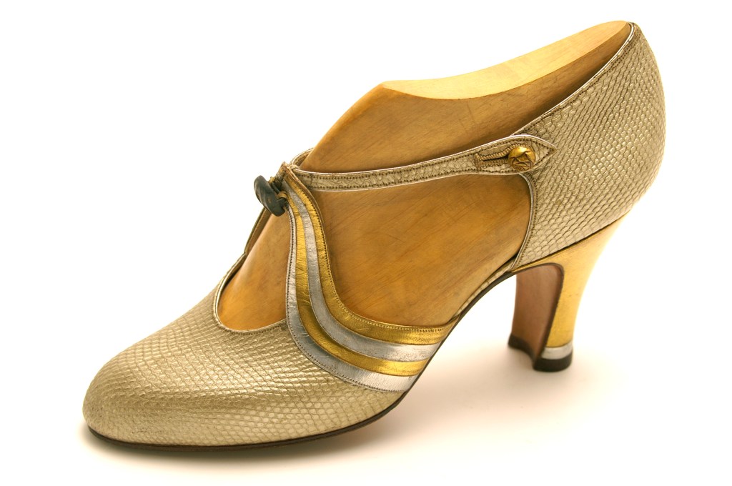 Véritables paradis des accessoires, les classes 21 et 22 offrent un choix infini aux garçonnes [ndlr : chaque classe correspondait à un domaine spécifique des arts décoratifs] : mouchoirs et écharpes, lingerie pour dames, blouses et déshabillés, bonneterie, corsets, boutons et boucles, gants, chaussures, parapluies, sacs à main, éventails, ceintures, chapeaux, parures de têtes, fleurs artificielles, plumes, sans oublier les chaussures ! À la ville ou à la campagne, pour trotter le jour, pratiquer un sport ou danser le soir sur un rythme endiablé, la garçonne choisit ses chaussures en fonction des circonstances. Les thèmes d’inspiration ne manquent pas aux créateurs. La chaussure devient artistique et les bottiers, des stars. L’un des plus célèbres se nomme André Perugia (1893-1977). Il voit le jour en Italie avant d’émigrer à Nice avec sa famille. Son audace et sa créativité le font repérer par Paul Poiret, qui lui confie la création de souliers pour un défilé. Convaincu par le couturier de s’installer à Paris, André Perugia ouvre sa première boutique au numéro 11 de la rue du Faubourg St Honoré en 1921. Le succès est au rendez-vous. Fidèle à son mentor Paul Poiret, André Perugia imagine les modèles Arlequinade ou Folie, en hommage à deux parfums du couturier. Il compte les artistes de music-hall, Mistinguett et Joséphine Baker, au nombre de ses plus fidèles et célèbres clientes. Ses Salomé font fureur ! Il s’essaie à la création de chaussures pour hommes et chausse le chanteur Maurice Chevalier. Tout lui réussit ! En 1927, il s’attaque au marché américain, il devient Mister Perugia, le bottier français adulé par les Américaines.
