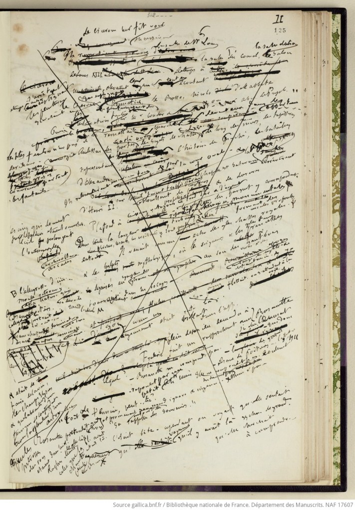 3. Le brouillon littéraire. Avec l’époque moderne commencent à apparaître des témoignages de la littérature en train de s’écrire, à travers des manuscrits autographes. Ce sont eux que l’on découvre dans le troisième temps de l’exposition, avec des textes des plus grands auteurs des XIXe, XXe et XXIe siècles. Cette section traverse l’âge d’or du roman, avec George Sand et Victor Hugo, jusqu’aux grands romans du XXe siècle avec Marcel Proust en tête de file. Le manuscrit de Mort à crédit, le second roman de Louis-Ferdinand Céline, est présenté ici pour la première fois au public.