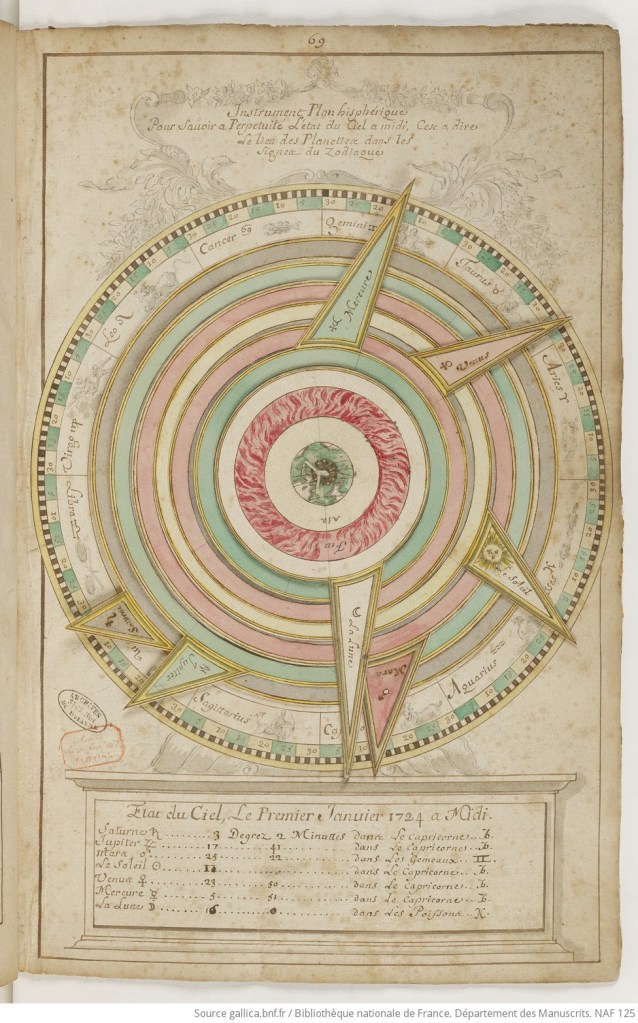 C’est sans doute grâce à sa carrière de capitaine de vaisseau que Thibaut Desmarchais a dû se familiariser avec l’astronomie. Ce manuscrit, qui n’avait jamais été présenté au public, est à la fois un exposé méthodique des connaissances de son temps sur la sphère céleste, les mouvements des astres et leur influence, et un véritable objet d’art, qui aurait été aussi complexe que coûteux à réaliser sous forme imprimée ; il se signale par la richesse de son décor peint et surtout ses figures mobiles qui, par un système d’attaches et de ficelles, permettent de déterminer, selon la date, la position des astres, les quartiers de lune, les heures des marées, etc.
