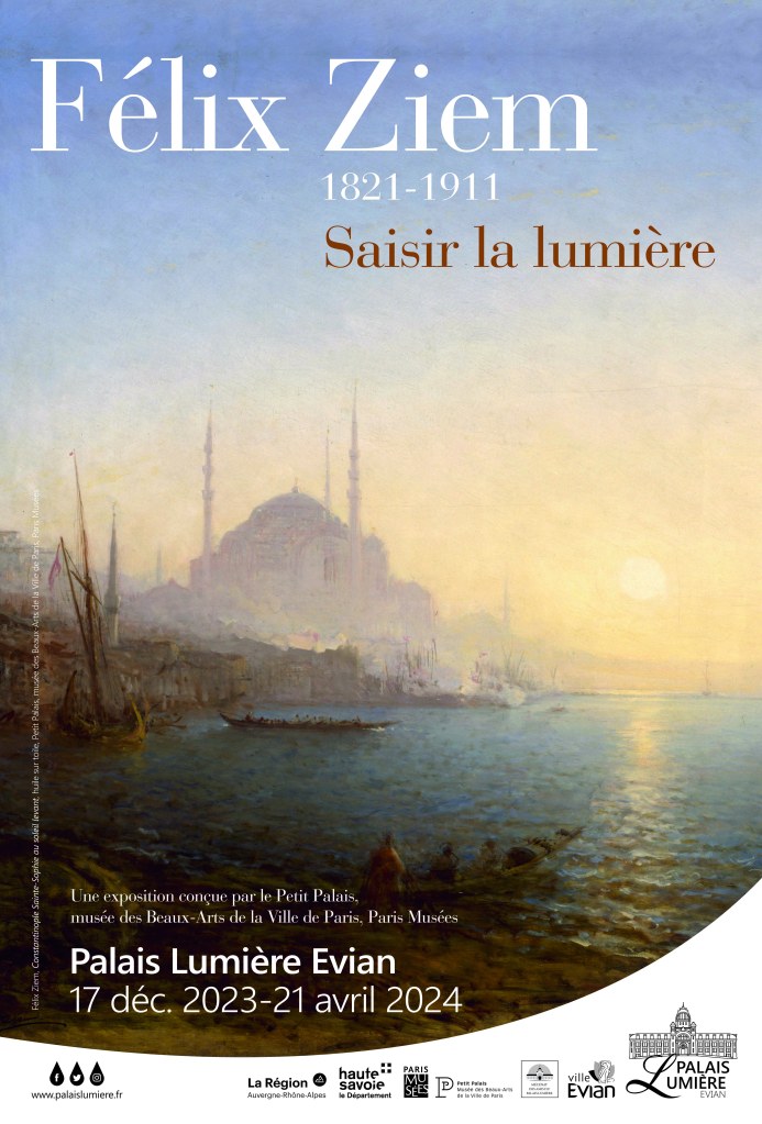 Le Palais Lumière et son dôme vitré bordant le Léman est le lieu idéal pour présenter l’œuvre d’un artiste qui a fait de l’eau et de la lumière un thème central. Du 17 décembre 2023 au 21 avril 2024, on redécouvre de façon singulière l’œuvre de Félix Ziem (1821-1911), peintre-voyageur pré-impressionniste et orientaliste. Homme universel, il symbolise, dans sa quête d’une nature idéale, l’ouverture au monde. L’exposition invite au rêve et à l’évasion avec des peintures représentant Venise, Saint-Pétersbourg, Constantinople ainsi que Marseille, Martigues, Paris… Ces tableaux aux lumières chatoyantes sont accompagnés de carnets, de croquis, de dessins et d’aquarelles. Le tout contextualisé par des extraits de musique contemporaine, de films d’époque et de documentaires. Une des volontés des commissaires d’exposition est de créer un pont entre les pratiques artistiques et les sociétés d’hier et d’aujourd’hui… Croiser les regards et les techniques pour provoquer un choc esthétique, intellectuel et émotionnel !