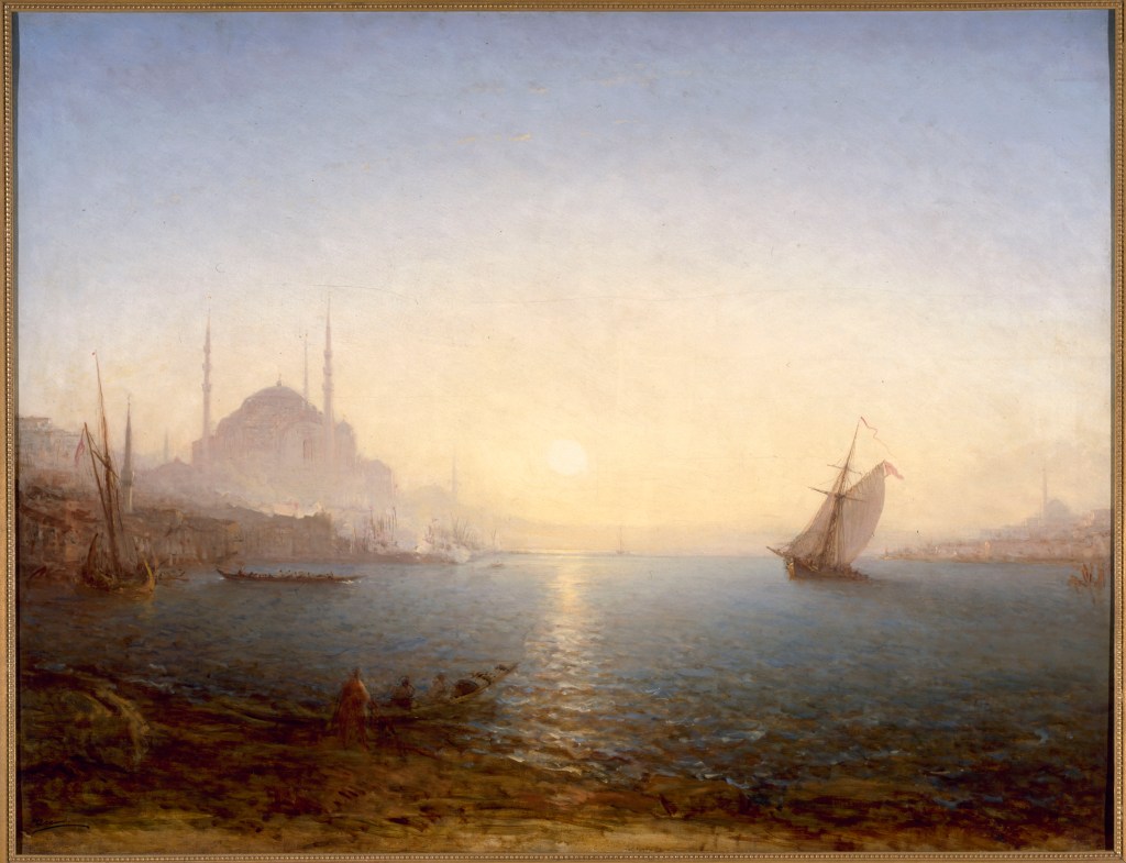 De retour à Paris, ses premières toiles directement inspirées de ce voyage en Orient sont présentées aux Salons de 1857 et 1859. Il décline inlassablement la silhouette de Sainte-Sophie, hérissant l’arrière-plan des vues d’Istanbul de minarets et de coupoles. La Corne d’Or ainsi réinventée est prétexte à toutes les variations atmosphériques.