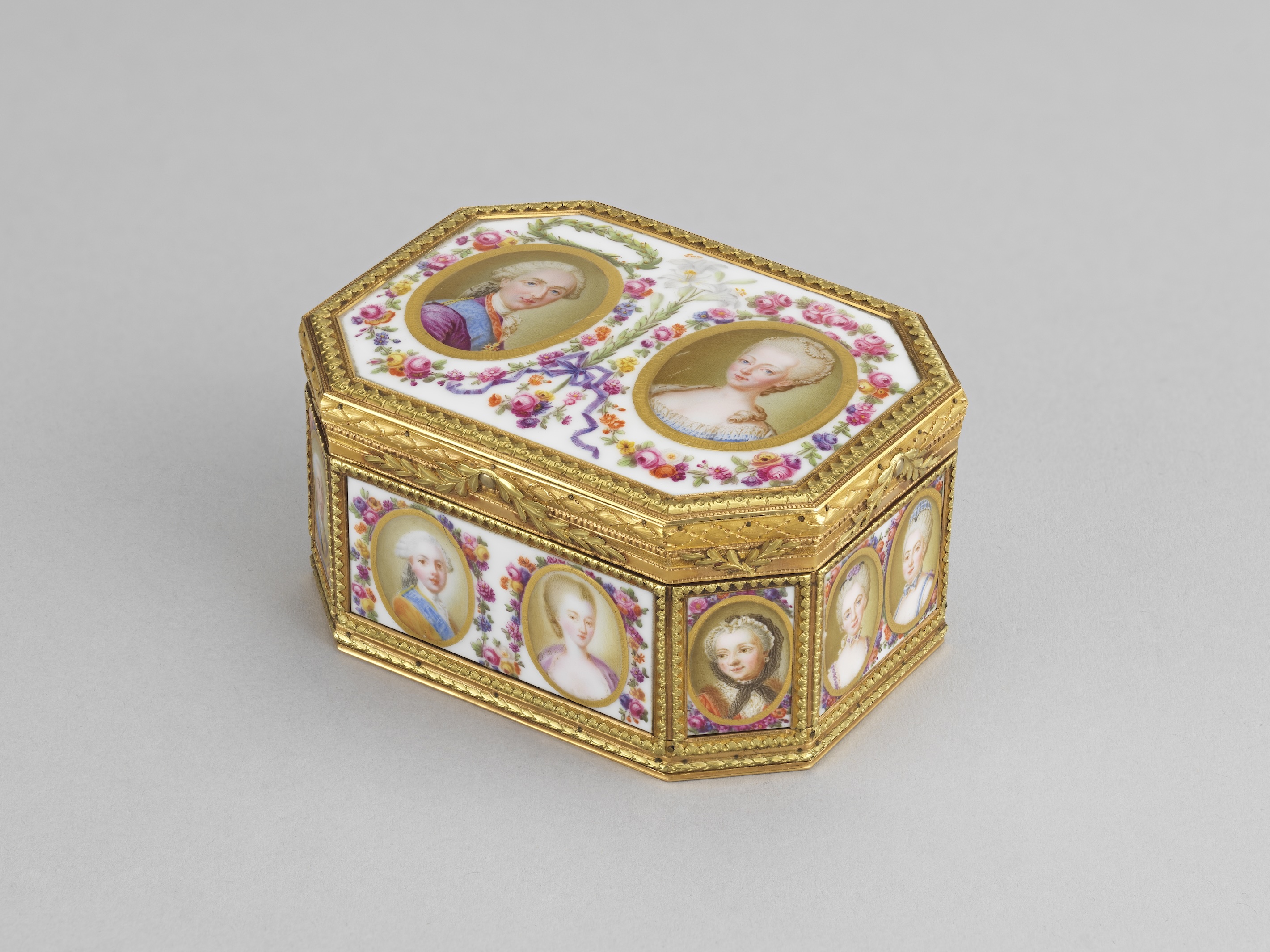 Cette tabatière de l’orfèvre Ménière est exceptionnelle par son ornementation, qui met en scène pas moins de seize portraits peints sur porcelaine. Véritable mémorial dynastique, elle représente le jeune Louis XVI et Marie-Antoinette, les princes et princesses de la maison de France, ainsi que les aïeux du roi, Louis XV et Marie Leszczyńska, entourés de guirlandes de fleurs. Probablement commandée par Louis XVI pour commémorer son accession au trône en 1775, cette tabatière était destinée à être offerte en cadeau, scellant ainsi les liens diplomatiques et familiaux.