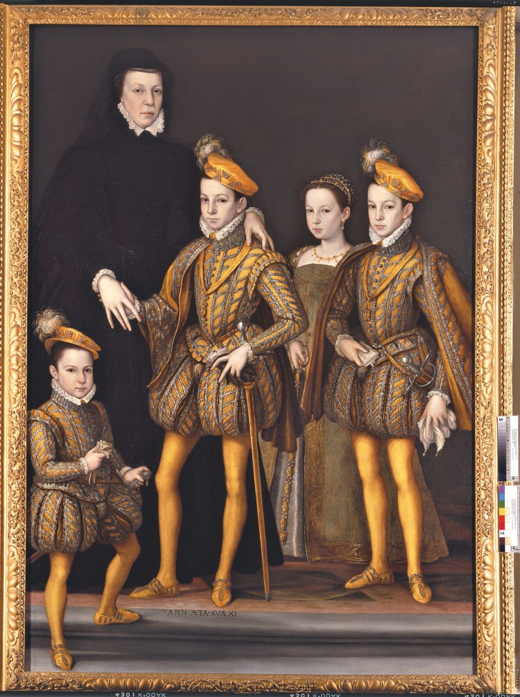 The portrait depicts a widowed Catherine de’ Medici (1519-89) dressed in black and holding the hand of Charles IX (1550-74), her third son, who was crowned King of France on the 5th of December 1560, aged ten, and for whom she acted as regent during the first three years of his reign. The inscription at the base of this painting: ANN AETA SUAE XI (‘in his eleventh year’), indicates that the boy had already ascended the throne in his minority. Beside Charles are his brother, next in line to the throne, the future King Henri III, pictured on the same level as Charles; his sister, Marguerite de Valois, future Queen of Navarre (1553-1615), set back from her brothers; and François-Hercule, Duc d’Anjou and Alençon (1555-84), lower left, separated by his age and status. Catherine’s gestures are highly symbolic, as she simultaneously presents the young monarch and protectively keeps him close to her.