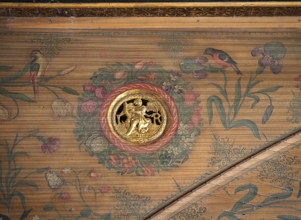 Clavecin IR 1624 , détail de la table d’harmonie montrant la rose et le millésime 1624
