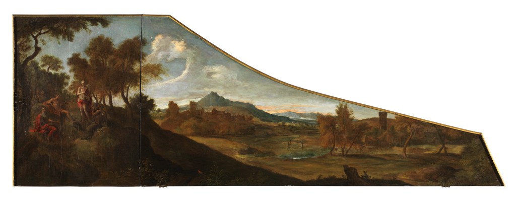 Le « ravalement » d’un clavecin s’accompagnait souvent d’une mise au goût du jour de son décor. La peinture noire à filets dorés, visible sur la caisse et le piétement du clavecin de Colmar, remonte peut-être à cette époque. Ce type de décor trouve des équivalents vers 1700 dans le mobilier d’ébénisterie français. Le couvercle flamand d’origine a été remplacé par un nouveau couvercle en bois de sapin. Sa face intérieure est peinte d’un vaste paysage agrémenté d’une scène mythologique empruntée aux Métamorphoses du poète latin Ovide. Sur l’abattant du couvercle, c’est-à-dire au-dessus des claviers, est représenté le duel musical entre le dieu Apollon, tenant la lyre, et le demi-dieu Pan, jouant de la flûte, en présence du roi Midas.