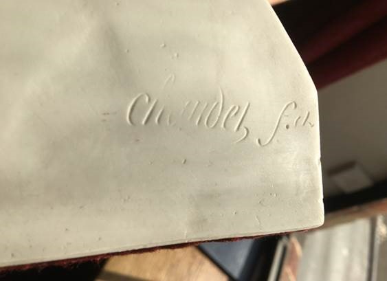 The original version of the bust on the Study desk was sculpted by Antoine-Denis Chaudet in 1799 before later produced by the Sevres manufacture on a larger scale, often as diplomatic gifts. The type of porcelain; biscuit or bisque refers to it being unglazed often white porcelain with a matte finish. The incised mark A B with a sloping cursive ‘B’ is the mark of Alexandre Brachard, head of the sculpture workshop, and the second with an upright ‘B’ that of Alexandre Brongniart director of the factory from 1800-47. The model was sculpted by Antoine-Denis Chaudet.