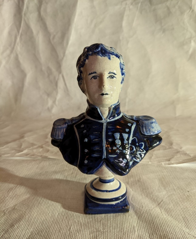 It is a Rouen delft ware portrait bust of Napoleon in full uniform with medals and a laurel wreath upon his head. It is twinned with a similar bust of Nelson on the other side of the display case, commemorating the two great leaders together as symbols of Britain and France’s power, conflict and respect.