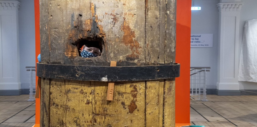 The centrepiece of the newly refurbished Victory Gallery is a section of HMS Victory’s foremast which was shot through by French cannon at the Battle of Trafalgar. The cannon ball created a gaping hole demonstrating the fearsome firepower of the French fleet.