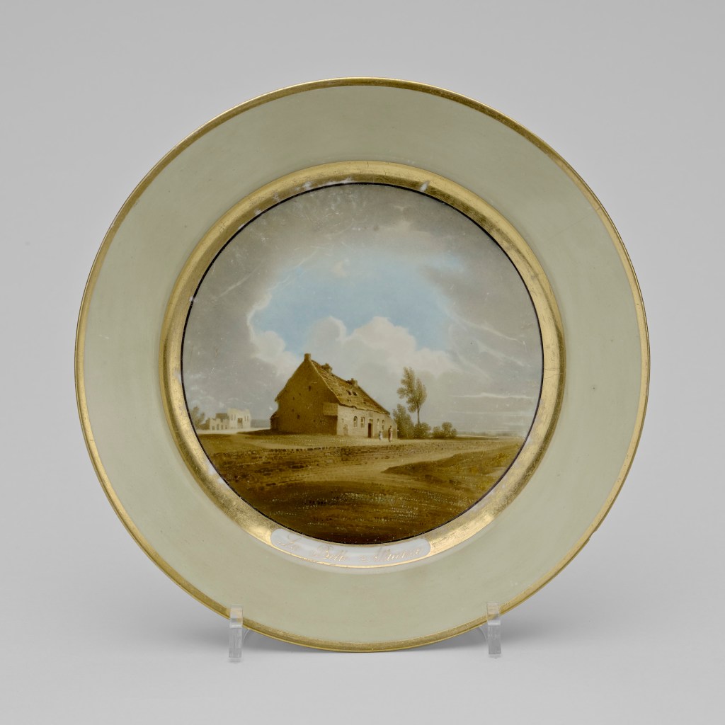 Cette assiette nous montre une vue de l’auberge, dite Ferme de la Belle-Alliance, et située au lieu-dit éponyme, à quelque distance du champ de bataille. Elle se trouvait en plein centre des troupes françaises au début des combats, mais est surtout connue pour avoir abrité l’entrevue entre les deux commandants des armées alliées, le Britannique Wellington et le Prussien Blücher, au soir de la victoire. Si son nom semble évoquer le beau mariage des premiers propriétaires (l’auberge apparait sous ce nom sur une carte des années 1770), elle est devenue l’expression de l’alliance entre les puissances européennes contre celui qu’on appelait l’Usurpateur. La bataille de Waterloo est ainsi, en quelque sorte, celle de la Belle-Alliance, comme la bataille de Leipzig est celle des Nations et Austerlitz celle des Trois empereurs. Seuls les Allemands semblent avoir gardé le souvenir de ce nom et il y eut pendant longtemps une « Belle-Alliance Platz » à Berlin.