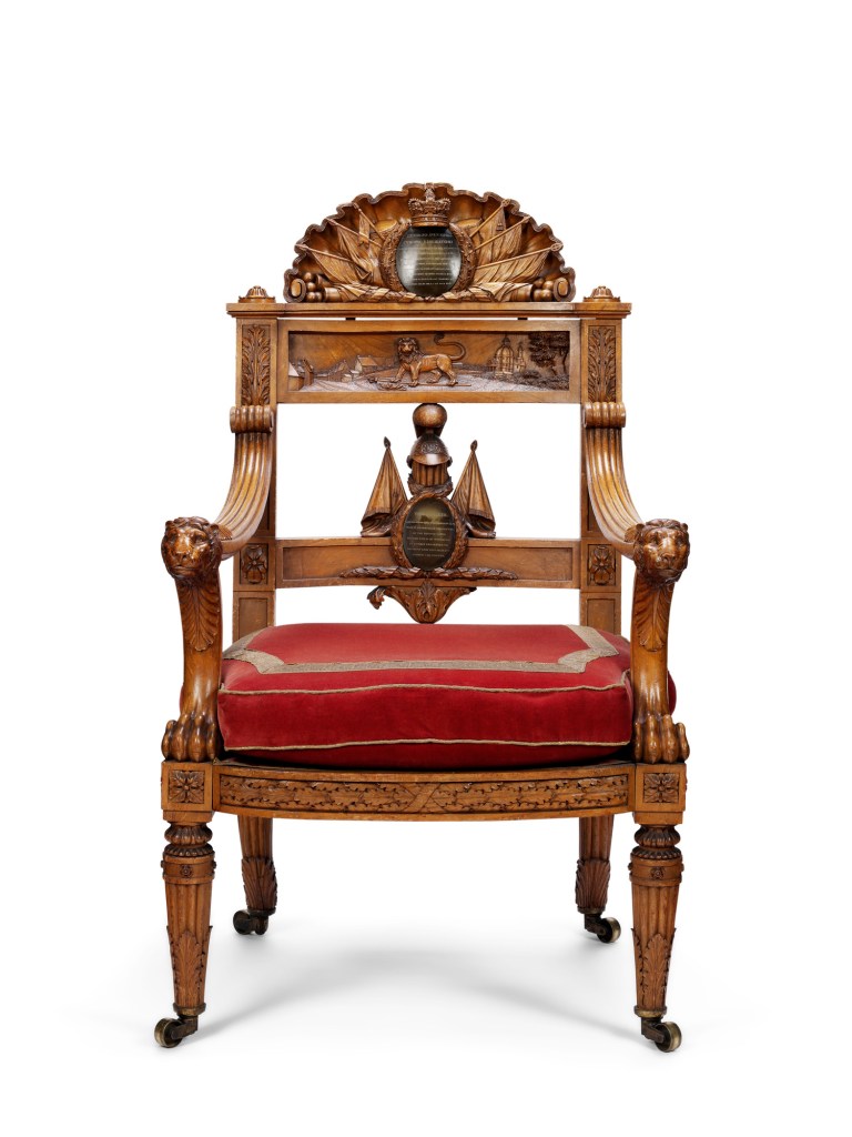 L’objet présenté ici est de première importance, puisque le bibliothécaire londonien le commanda à l’illustre ébéniste Thomas Chippendale le Jeune (1749-1822), le fils du Thomas Chippendale (1718-1779) qui avait marqué si brillamment l’histoire du mobilier anglais au XVIIIe siècle. Le fauteuil était destiné à être offert au Prince Régent, et, effectivement, il entra dans les collections de Carlton House le 24 février 1821.