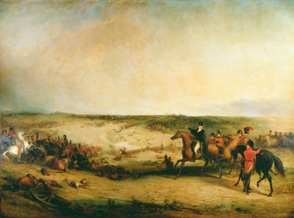Ce tableau de George Jones nous plonge au cœur de la bataille. Le peintre sait de quoi il parle, puisqu’il a combattu sous les ordres de Wellington pendant les guerres de la péninsule ibérique. Commandée par Georges IV en 1822, ce tableau orne les murs de la salle du trône du palais de Saint-James, où elle accompagne l’autre grande œuvre de Jones, La bataille de Vittoria, présentée plus haut. Au premier plan, on voit le duc de Wellington, monté sur son cheval Copenhagen. Comme nous l’avons déjà remarqué, Arthur Wellesley a reçu ce titre avant la bataille de Waterloo, en récompense pour ses victoires au Portugal et en Espagne. Presqu’au centre de la composition, on aperçoit Napoléon au milieu des combats, sur son cheval blanc.