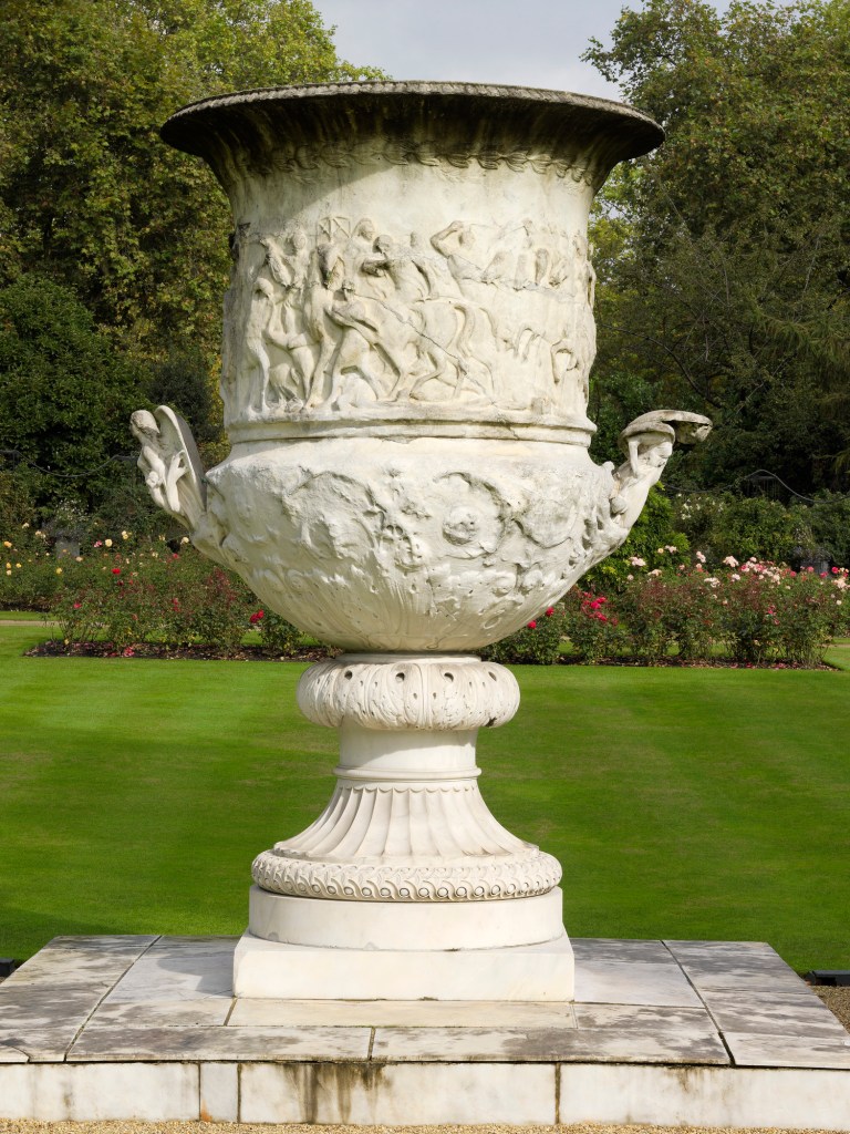 Mais revenons au bloc. D’après les conservateurs des collections royales, les architectes et décorateurs Charles Percier et Pierre Fontaine avaient prévus de faire sculpter dans ce bloc un immense vase, qui aurait été placé au cœur du palais du roi de Rome, le gigantesque palais impérial que Napoléon prévoyait de faire construire sur la colline de Chaillot et dont les jardins auraient rejoints le bois de Boulogne. Mais la campagne de Russie et la grave crise économique qui touche l’Empire empêchent la construction du palais et le bloc de marbre reste en Toscane. En 1814, après la débandade russe et le soulèvement de l’Europe contre l’Empereur, les Baciocchi sont chassés de leurs États et le grand-duc de Toscane est à nouveau un Habsbourg. En 1815, Ferdinand III (1769-1824), qui est le frère de l’empereur d’Autriche et l’oncle de l’impératrice Marie-Louise, décide d’offrir le bloc de marbre au Prince Régent. Celui-ci désigne Richard Westmacott (1775-1856) pour sculpter un vase commémorant la victoire de Waterloo.