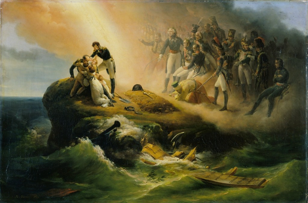 Bien sûr, l’Empereur a été enterré dans les terres, près d’un ruisseau, mais Vernet a replacé sa tombe sur un éperon rocheux, entouré par les flots. À ses pieds, les débris d’un navire, une ancre. La quille égrène les étapes d’une vie de combats, des victoires et une défaite finale : Rivoli, Pyramides, Marengo, Austerlitz, Iéna, Wagram, Moskova, Montmirail, Ligny, Waterloo. Une couronne de laurier flotte dans les eaux, comme si la gloire de l’Empereur était emportée par les flots. La fin d’une époque. Le début d’une légende.
