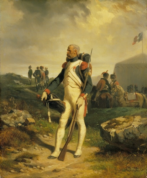 Sur le tableau de Bellangé, l’Empereur est plus proche, mais un peu seul, bien qu’accompagné de trois officiers. Le premier Napoléon semblait décidé, les bras croisés, celui-là résigné, les bras derrière le dos. L’artillerie a cédé sa place à la cavalerie. Plus de camp de fortune mais une tente parée du drapeau tricolore. Le grenadier évite notre regard. Il est vieux et semble lassé de son bonnet. Lassé de tout en fait. Comme l’Empereur.