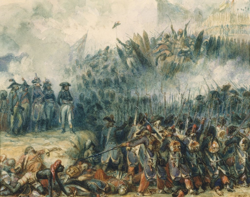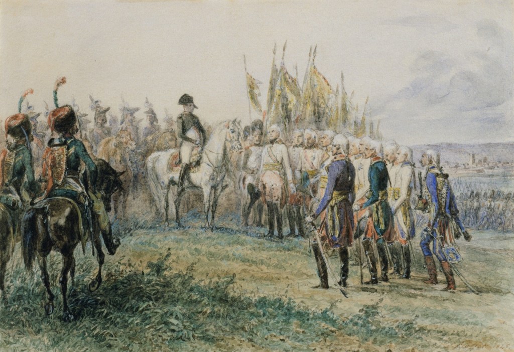 Sur le tableau suivant, Napoléon Ier est cette fois victorieux. Après la rupture de la paix d’Amiens (1802-1803), le Premier consul regroupe une grande partie de ses armées au camp de Boulogne, en prévision d’un débarquement dans les îles britanniques. Mais les Anglais, pour l’éviter, financent une troisième coalition contre la France. En août 1805, l’Autriche envahit l’allié bavarois et Napoléon, proclamé empereur le 18 mai 1804 et couronné le 2 décembre suivant, fait « pirouetter » les troupes de Boulogne vers l’Allemagne. Bientôt, les armées du général Mack sont contraintes à s’enfermer dans Ulm, encerclées par celles de l’Empereur. Dès le 20 octobre, après seulement quelques jours de siège, les Autrichiens se rendent. 25000 soldats à la solde des Habsbourg sont capturés et tous, sauf les officiers, sont envoyés en France. Les officiers, eux, doivent promettre de ne plus se battre contre l’Empereur. Cette scène est représentée par plusieurs artistes, notamment Charles Thévenin et, ici, Auguste Raffet. Finalement, c’est la bataille d’Austerlitz, le 2 décembre suivant, qui marque l’anéantissement (temporaire) de l’Autriche et de la Russie.