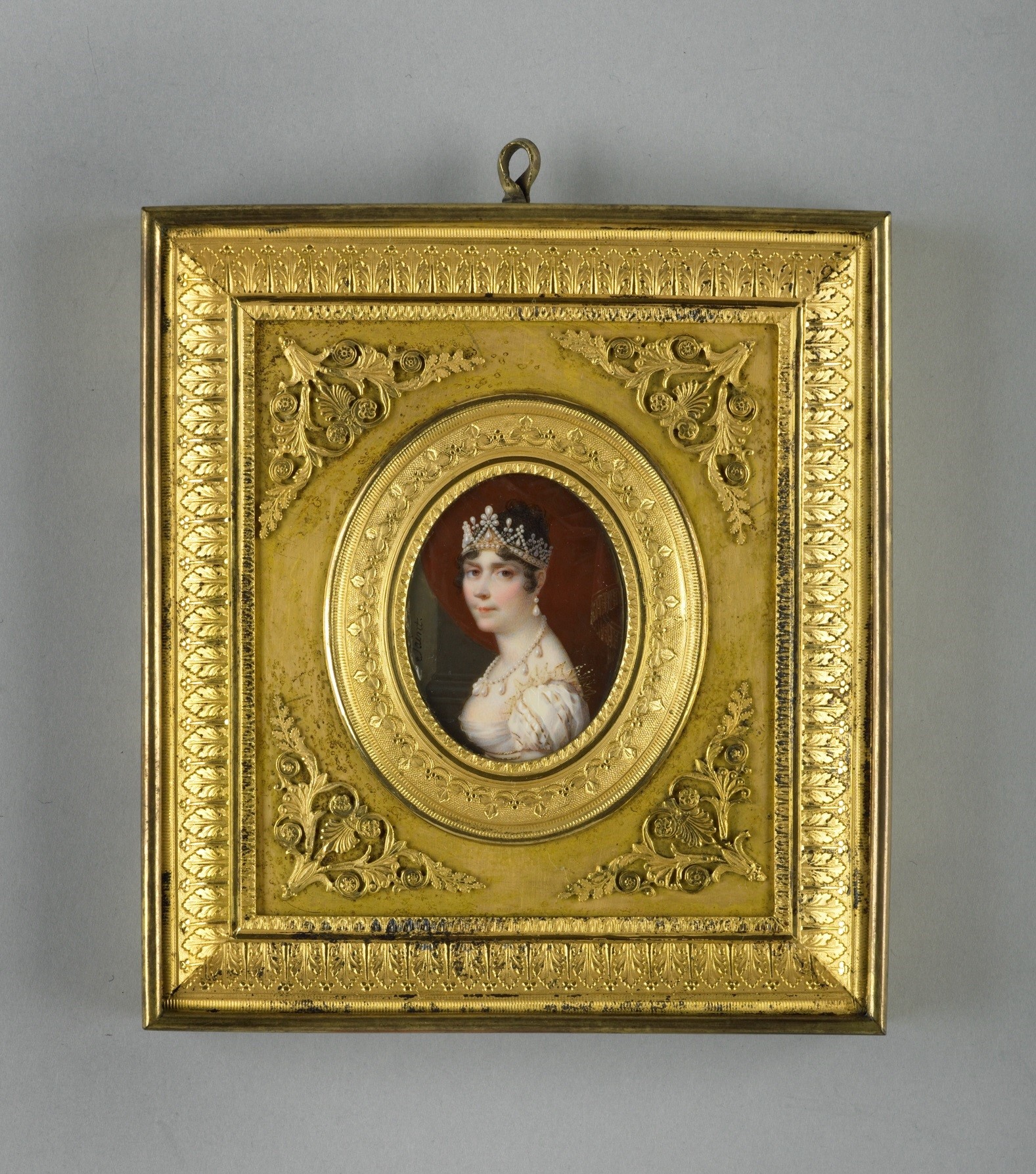 Puis vient le temps de la gloire pour Joséphine, dans les salons et les alcôves des nouveaux dirigeants, Hoche, Tallien et autre Barras. C’est là (dans un salon, d’abord) qu’elle rencontre Napoléon, un petit général corse qui commence à faire parler de lui. Ils se marient le 9 mars 1796, six mois après leur première rencontre. Il est indéniable que l’influence et l’ambition de l’un a profité à l’autre, et inversement. Encore quelques années et Joséphine devient l’épouse du Premier consul, mais surtout la toute première impératrice des Français. Elle est couronnée avec Napoléon Ier, à Notre-Dame de Paris, le 2 décembre 1804. Le fameux tableau de David a contribué à sa légende puisque, comme on le sait, il ne représente pas le pape Pie VII qui couronne Napoléon (il s’est couronné lui-même), mais l’Empereur couronnant Joséphine. La Wallace Collection conserve un magnifique portrait de l’Impératrice où Prud’hon révèle sa grande beauté, ainsi que quatre miniatures, dont l’une, par Isabey, est associée à celle de son auguste époux.