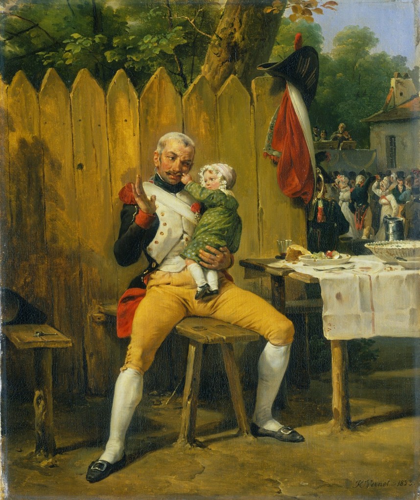 On retrouve une forme de nostalgie dans les deux tableaux suivants de Vernet. Elle semble presque joyeuse dans la première : le vétéran a retrouvé son village, son foyer, sa famille, son enfant. Peut-être un enfant qu’il rencontre pour la première fois. C’est la fête, les gens dansent après un bon repas. Est-ce qu’on célèbre son retour ? Lui ne semble pas intéressé par la fête, tout occupé qu’il est à rattraper le temps perdu avec son enfant. Mais l’uniforme est là, rutilant, presque trop quand on sait dans quel état sont revenues les armées de l’Empereur après Waterloo. Il y a le bicorne, l’épée, la Légion d’honneur. En fait, est-ce que cet épisode précède Waterloo ? Est-ce qu’on célèbre le retour de l’Empereur ? Est-ce que le soldat s’apprête à repartir et dit au revoir à son enfant ? Alors, pourquoi avoir nommé ce tableau « le vétéran à la maison » ? Tableau compliqué à décrypter, encore une fois.