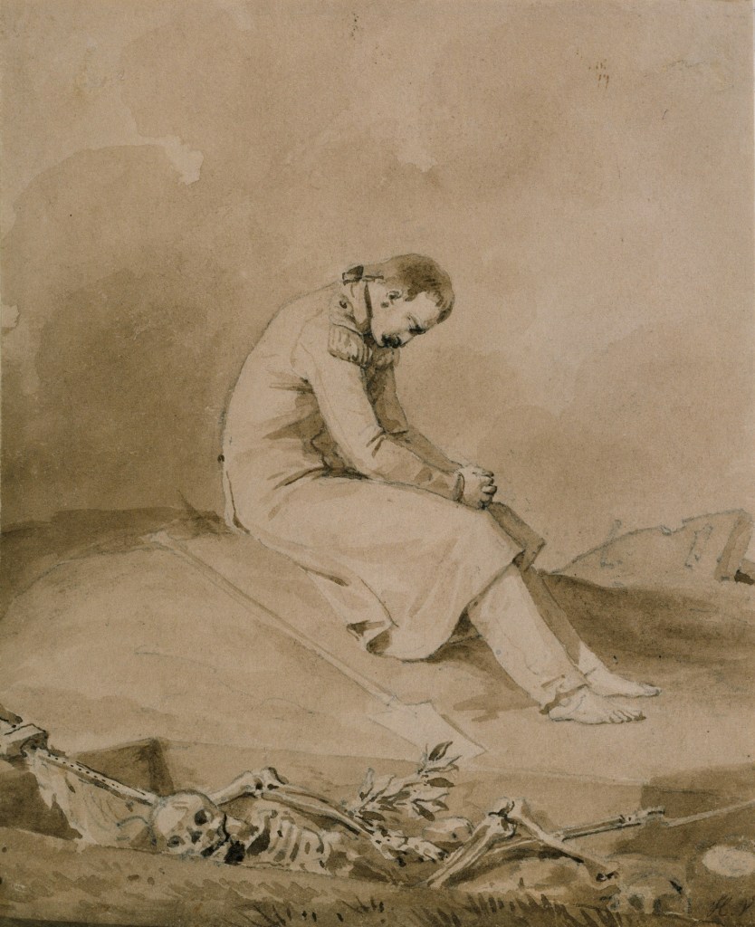 Dans le tableau suivant, Vernet témoigne du fardeau des survivants. Encore une fois, l’œuvre est imagée. Le soldat, qu’on pourrait presque prendre pour Napoléon, semble désespéré. Assis sur un monticule de terre, pieds nus, avec une pelle à ses côtés, il a sans doute creusé la tombe de son compagnon. Ici le fardeau est concret, physique, matériel. Sauf que le soldat mort est déjà à l’état de squelette. Par une contraction du temps (comme le tableau précédent était une contraction de l’espace), Vernet a représenté la mort : quoi de plus précis qu’un squelette pour la représenter ? Le défunt soldat est là, avec son fusil à baïonnette, son drapeau qui part en charpie, mais aussi ses feuilles de laurier. Mais c’est aussi le fardeau moral du survivant que représente le peintre : le fardeau de survivre à ceux qui sont partis, le fardeau de vivre la défaite alors que ceux qui sont partis ont rencontré la gloire, le fardeau d’avoir ardemment combattu pour quelque chose qui, tout à coup, semble presque dérisoire, inutile, vain. Le fardeau de la guerre. Le fardeau de ceux qui font la guerre pour ceux qui l’ont décidée, aussi.