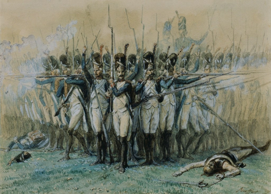 Avec la Légion de la Vistule, dont un des soldats est ici représenté par Horace Vernet, on fait un saut de quelques années. Un des aspects de la politique militaire napoléonienne est l’obligation par les pays frères, vassaux ou amis de fournir des renforts pour les armées françaises. C’est ainsi que des soldats de l’Europe entière suivent l’Empereur au-delà du Niémen. Parmi eux, beaucoup de Polonais.