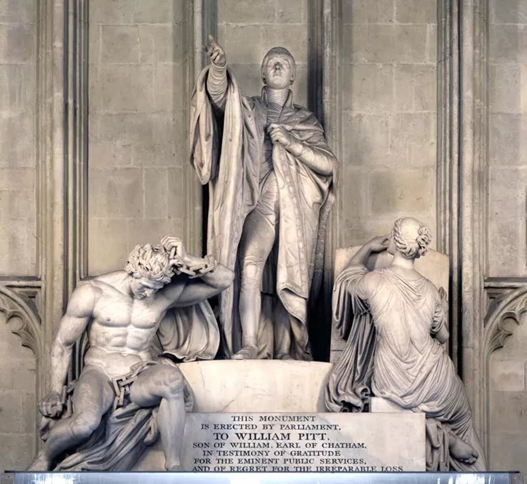 Cinq ans plus tard, en 1783, son fils, William Pitt le Jeune (son frère aîné, John, avait succédé à leur père comme 2e comte de Chatham) devient le plus jeune Premier ministre de l’histoire britannique, à l’âge de 24 ans seulement. Chef du parti tory et fervent partisan de l’autorité royale, il conserve ses fonctions pendant 17 ans et 86 jours, jusqu’en 1801. C’est donc lui qui gouverne la Grande-Bretagne lorsque la Révolution française éclate, qui adhère à la première coalition (1792-1797) et à la deuxième coalition (1798-1802), qui doit combattre les armées du jeune général Bonaparte, puis du Premier consul. Il démissionne le 14 mars 1801, mais est rappelé le 10 mai 1804. Le second gouvernement Pitt voit la proclamation de l’Empire. Comme Perceval, il meurt dans l’exercice de ses fonctions, mais de problèmes de santé, le 23 janvier 1806. Le 22 février suivant, il est inhumé aux côtés de son père, dans le transept nord de l’abbaye de Westminster. Sa tombe est difficile à identifier, l’inscription étant en partie effacée, mais il dispose d’un somptueux monument au-dessus du portail principal de l’église. Son effigie de cire est également exposée dans les Queen’s Diamond Jubilee Galleries.