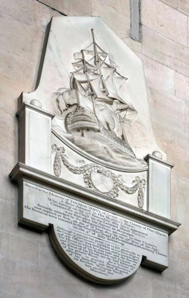 Comme beaucoup de marins et soldats évoqués dans ce parcours, Thomas Totty, né en 1746, a fait ses armes aux Treize-Colonies, avant de combattre les troupes de la Révolution et de l’Empire. Atteignant le rang de contre-amiral, il a notamment été amiral du port de Chatham, puis commandant de la flotte dans les Antilles. À la Martinique, il contracte la fièvre jaune et meurt à bord de son navire, le 2 juin 1802. Il est inhumé à la chapelle de la garnison de Portsmouth.