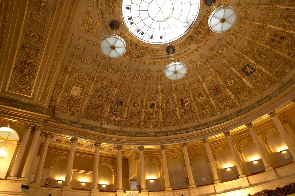 Wanneer bezoekers de vergaderzaal van de Belgische Senaat binnenkomen, is het eerste wat de aandacht trekt het vergulde plafond van de koepel (fig. 10). Het verguldsel, alsook de kleur van de wapenschilden en de gebeeldhouwde koninklijke cijfers werden in 1863 aangebracht op een witte neoklassieke koepel die samen met de vergaderzaal in 1849 door architect Tilman-François Suys werd gebouwd.